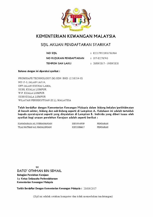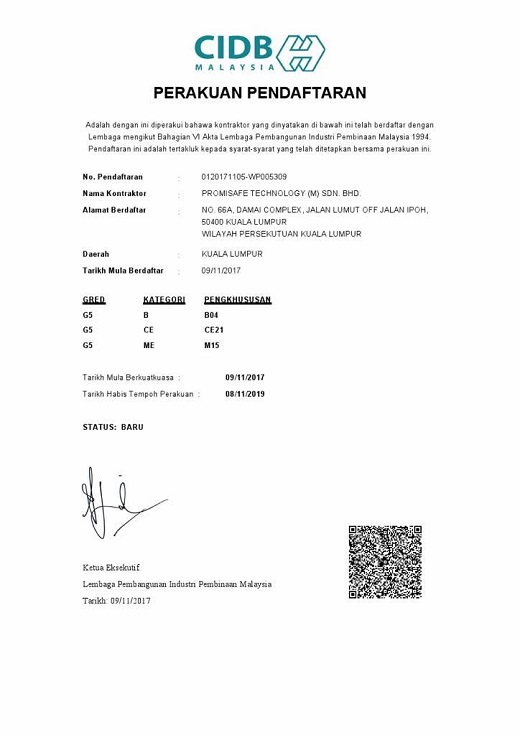 The company was established by a group of young and dynamic people. PROMISAFE TECHNOLOGY (M) SDN BHD formerly known as PROMISAFE TECHNOLOGY was established in 2008. The company was upgraded from Enterprise to Sdn. Bhd. in year 2016 due to the expansion of our business and services to our customers.